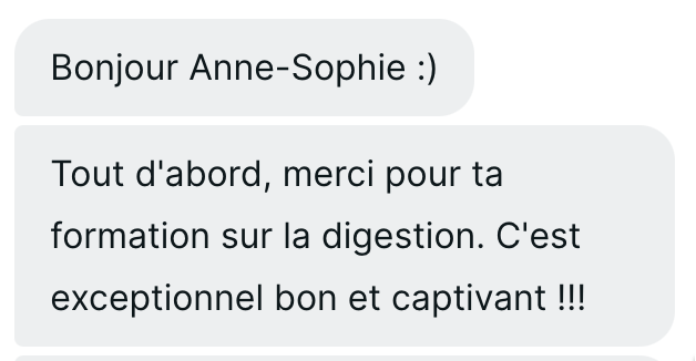 Le fait de comprendre le fonctionnement de la digestion et les enjeux pour avoir une bonne digestion m'ont permis de mettre en place des choses réellement efficace et de savoir ce qui fonctionnait pour moi.