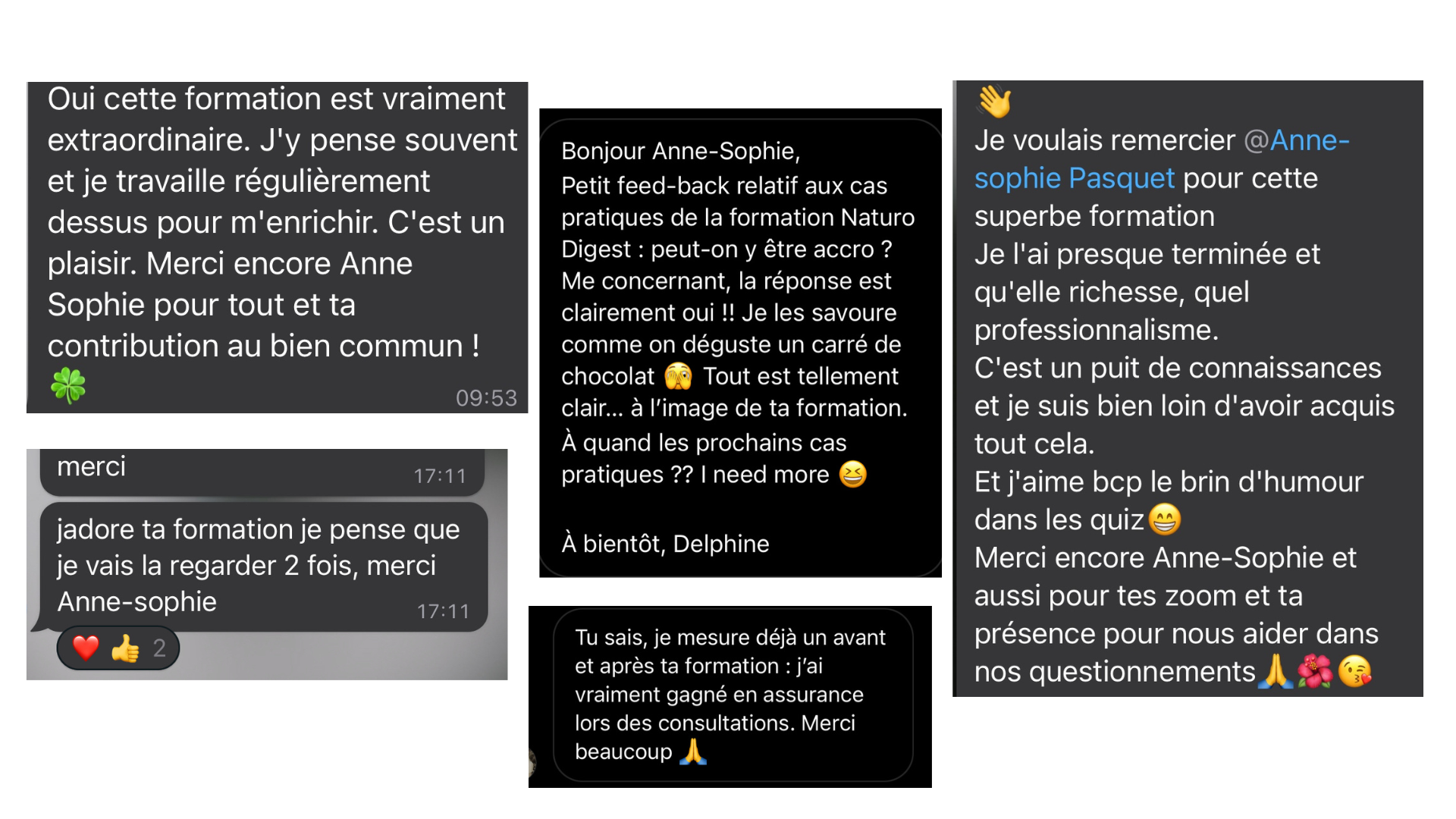 "La formation d'Anne-Sophie est de grande qualité. Elle complète vraiment bien ma formation de naturopathie grâce à son expertise de la digestion et de la micronutrition. J'ai l'impression d'être vraiment montée en compétence sur l'accompagnement des troubles digestifs.